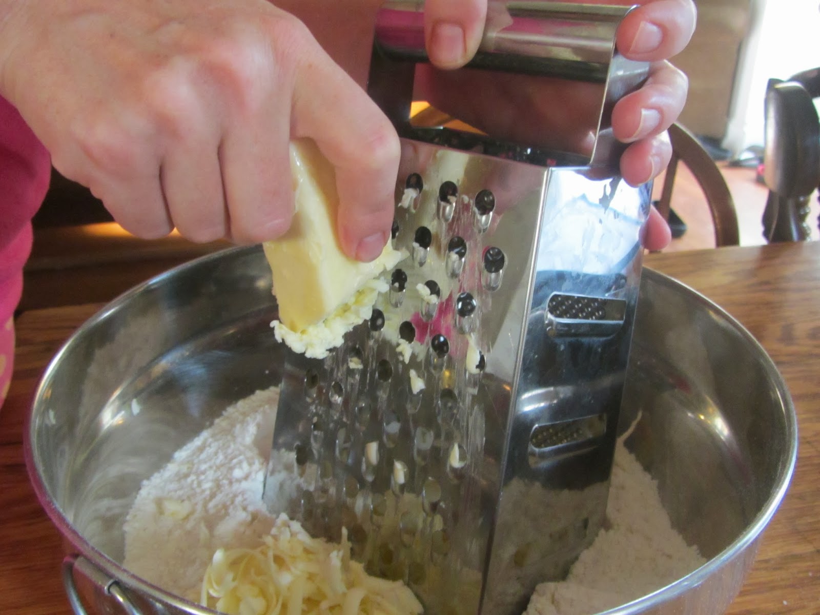 Whisk together the flour, cinnamon, baking powder, baking soda, and salt and set aside. In another bowl, stir together the carrots, chopped nuts, and raisins.