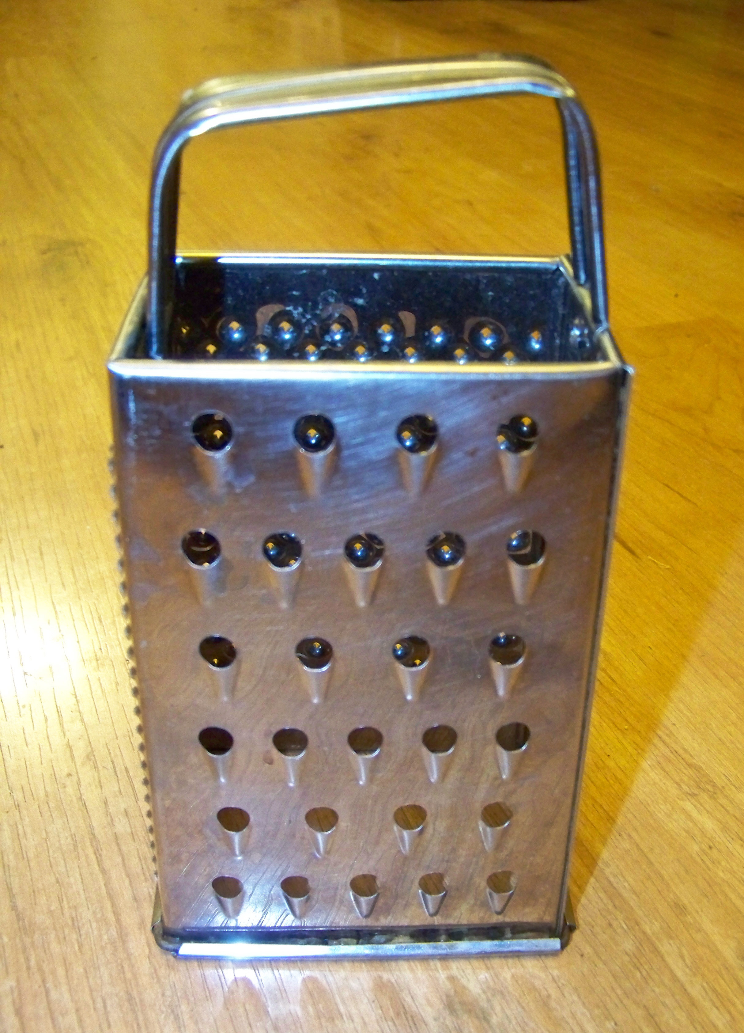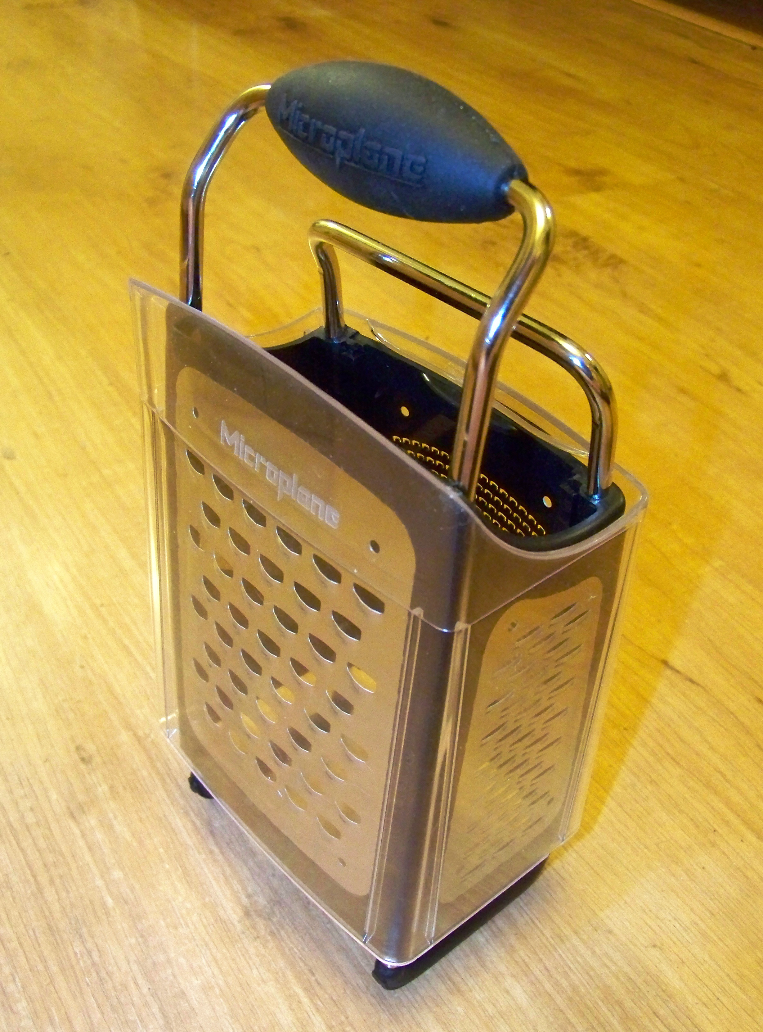 I’ve never had a happy relationship with any box grater, ever. For the most part, they are designed for a child’s hand, are honed about as sharp as Carrot Top’s wit, and embody the confidence-inspiring sturdiness of single-ply bathroom tissue. Basically, they feature one marginally useful side (pictured), while the other three are for clogging, juicing, and… I never quite figured out what that fourth side was for. On occasion, I might be able to shred cheddar, provided it nailed the precise thermal sweet spot where it neither crumbled nor smeared, which, to the best of my ability to determine it, is 2.5˚C (36.5˚ F), or just slightly colder than the interior of my fridge. Accordingly, the potential gratee usually detoured briefly to the freezer while I tried to triangulate the stay required to arrive at la température idéale. Upon its removal, I had roughly 41 nanoseconds to complete my task before the warmth of my hand and the ambient temp turned le fromage into un blob gluant. Back to the freezer, 41 more nanoseconds, again and again and again.