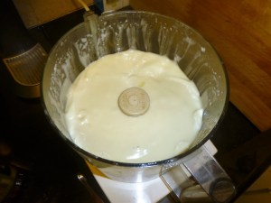 Begin adding ice water and vinegar solution a tablespoon or two at a time, and pulsing until dough begins to have enough moisture to cohere. There’s not a great way to explain this in print, which is why there are apprentices and grandmothers. Once you feel it, you will understand. In the meantime, check this vid, and you’ll get a sense of the process. [The video version is done with a pastry cutter rather than a food processor, but you’ll see how the chef gets where she needs to go.]
