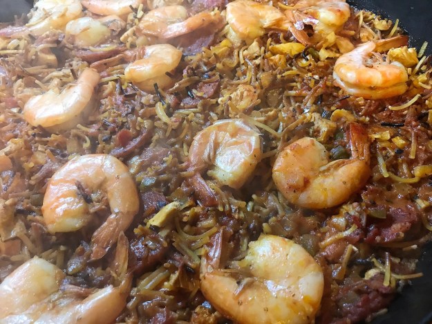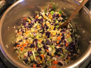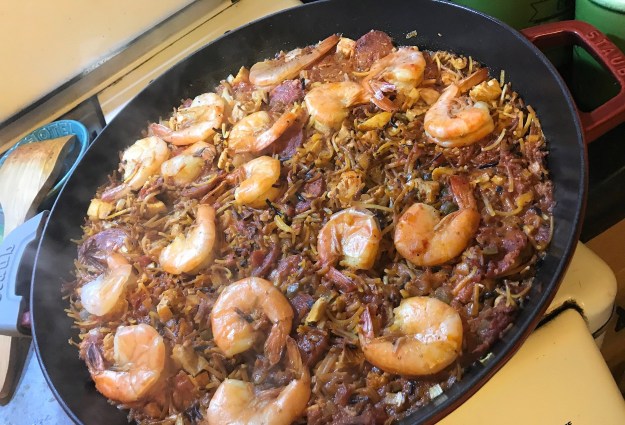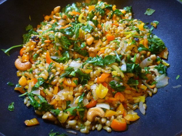 After onions have browned, increase the heat under the pan, add minced celery, and sweat it for a couple of minutes, stirring occasionally. Then stir in lentils, minced garlic and spice mix, and cook for about 2-3 more minutes. Reduce heat and fold in mushrooms; simmer, stirring occasionally, until mushrooms have softened and released their liquor, about 15 minutes. If mixture seems too dry at any point along the way, add between 2 tablespoons and 1/4 cup (30 – 60 ml) of reserved mushroom rehydrating broth. When mushrooms are cooked, fold in mashed potatoes and mix with wooden spoon so that all ingredients are distributed evenly throughout. When it’s all warm (about 5-10 minutes), taste and adjust spices as necessary. [This usually means a bit of salt and pepper, but if your palate is discerning, you may detect that one element or another of your spice blend has disappeared, so you can fix that as well. Be forewarned: cloves, cinnamon, and ginger are very assertive, so add with caution, if at all.]