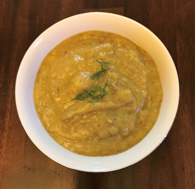 While potatoes are boiling, rinse lentils and remove debris, if any. After potatoes have been removed from the saucepan, you can cook the lentils in the already-warm potato water, boiling gently for 20 minutes. When they are done, drain them, discarding the potato water, and set aside.