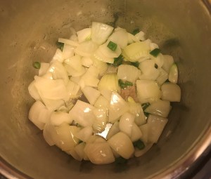 Dice onion, and add it along with the olive oil to a large pan (big enough to hold all the ingredients, which it eventually will). Brown onion, stirring occasionally, about 25 minutes or so.