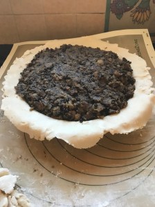 Roll out the dough from the center outwards until you have a sufficiently large crust for the bottom, two to three inches (5 – 7.5 cm) bigger than the pan. Don’t worry about overhang; that will be incorporated later. Once bottom crust is set in pan, fill with mushroom/lentil/potato mix, making sure to distribute it evenly.