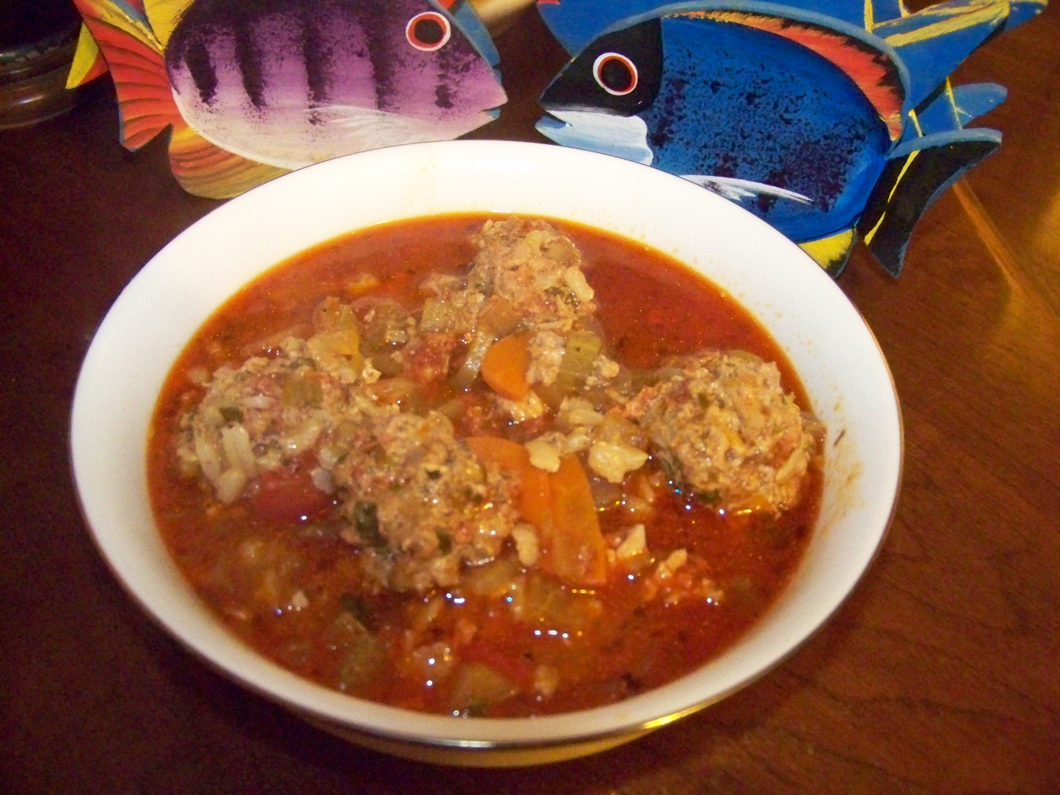 Far as I’ve been able to discover, there are two general schools of thought on sopa de albóndigas. One holds that it’s primarily a tomato-based soup, and the broth ought to be more or less jam-packed with tomato-y goodness and coloured fire engine red (PMS 199); the other is that tomatoes play a role, but not the lead. I opted for the latter. After all, I’d gone to some trouble to make the turkey stock, and I didn’t want it completely buried in the mix. The soup ultimately turned out a rich red colour, but that was thanks to the chorizo, not the tomatoes (as you can see in the picture below, when it was just the veggies and stock).