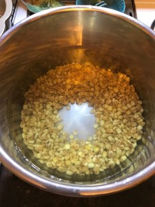 Making the broth is super easy; basically, you just dump it all into a big pot, bring it to a boil, and then back it off to a simmer. I let mine simmer for a couple of hours, because I started making it one evening after dinner. [In fact, I put the broth in the refrigerator overnight and finished the soup the following day.] If, however, you are doing a same-day soup, allow it to simmer for about an hour, so you can soften up the celery and onions and carrots, and give the flavours a chance to blend.