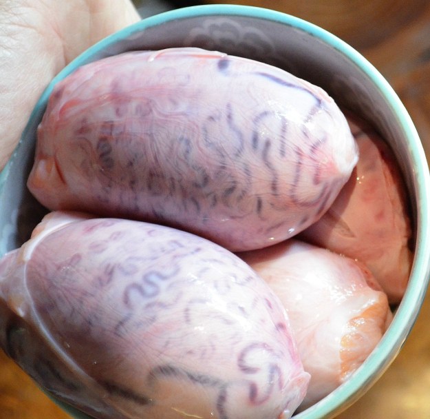 Ribbons of soba in egg bites that bear a disturbing similarity to what are euphemistically known as “bull fries.”