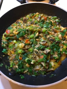 If your leftover soba noodles are in the fridge, put the ones you’re using for the recipe in a bowl with 4 tbsp. / 60 ml of the coconut curry sauce and let them sit overnight, or at least for a couple of hours; they’ll soak up the flavour. If you’re making the noodles expressly for this recipe, take the still-warm drained noodles and pop them in the bowl with the curry sauce and let them sit for as long as you can; overnight is best. In fact, I made both the soba noodles and the mushroom/cilantro/scallion combo the night before, because the timing worked out for me.