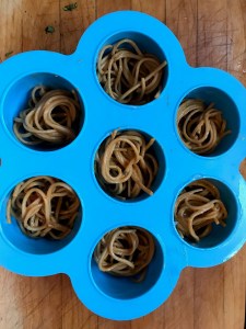 I’m pretty sure you don’t just happen to have 5 ounces (or 150 g) of cooked soba noodles lying about, so allow me to offer you an option for the rest of the soba noodles you’re likely to cook in order to make this recipe. [This No Spoon Necessary blog’s recipe was the inspiration for last night’s dinner, but since the bride and I are ovo-lacto vegetarians until Lent’s end, I had to mess with it a bit. That’s another post for another day.] Also, this version is dairy-free, unlike most other egg bite recipes.